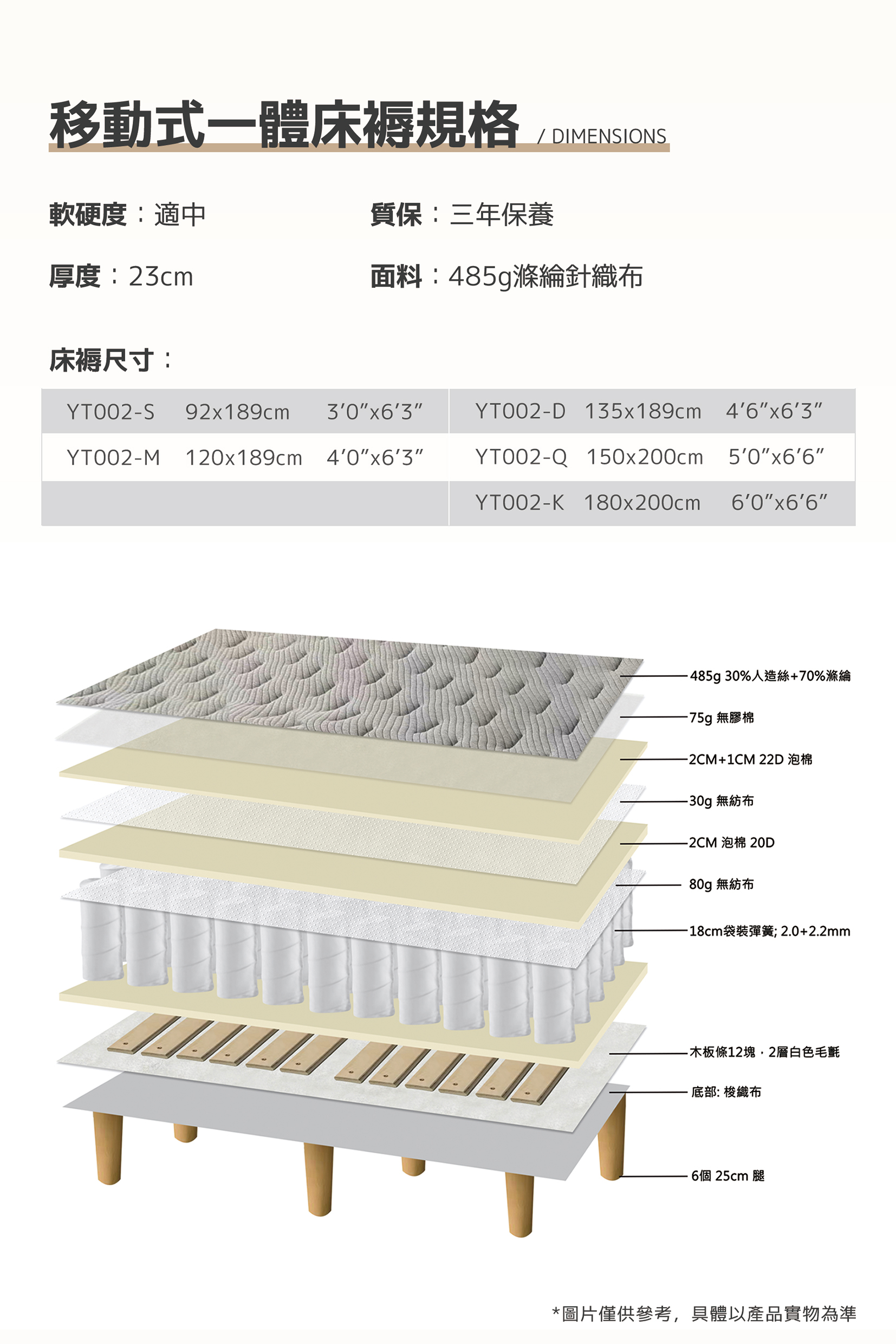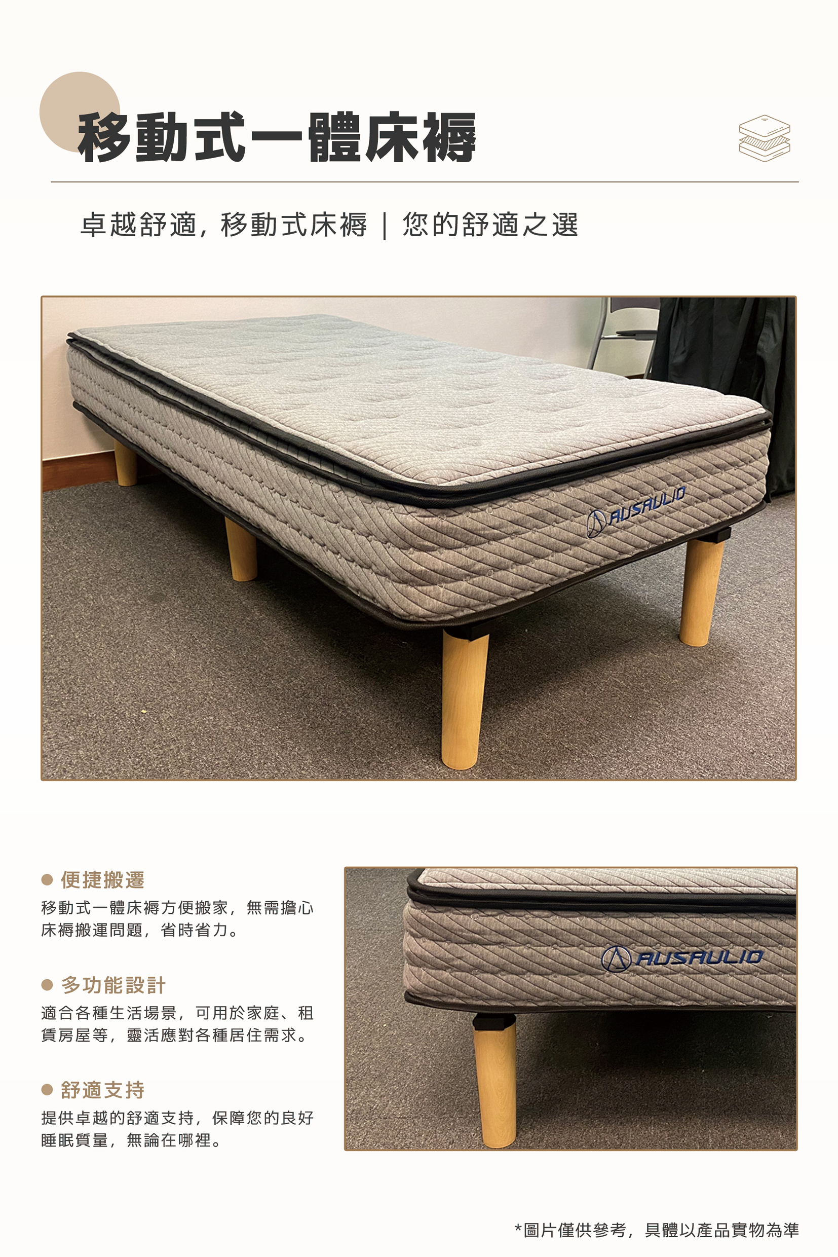 一體式設計免床架, 方便隨意擺放或搬運.